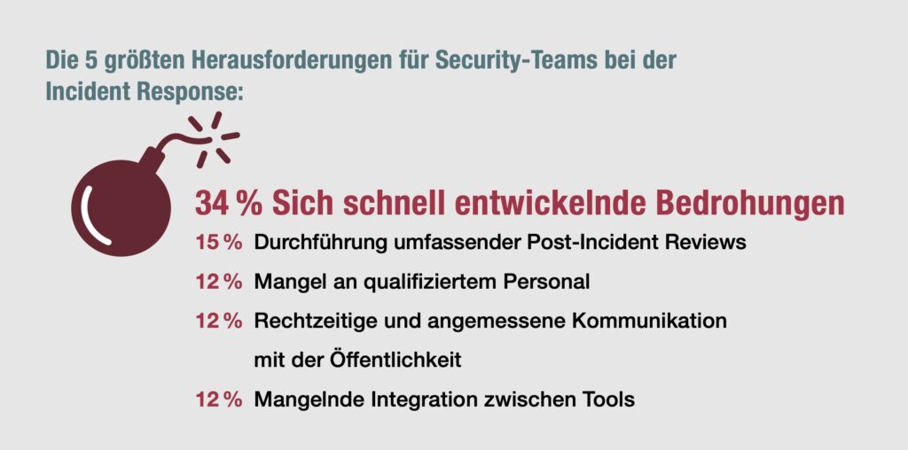 Trotz der verstärkten Konzentration auf IT- und Cybersicherheit sind viele Unternehmen in wichtigen Bereichen nach wie vor unterfinanziert. Für die meisten derjenigen, die mit der Finanzierung von IT und Cybersecurity in ihrem Unternehmen unzufrieden sind, bilden unzureichende Investitionen in Software und Security-Awareness-Schulungen (jeweils 27 %) die Hauptprobleme. Fast ebenso viele (26 %) nennen einen Bedarf an mehr Investitionen in die Infrastruktur, während 21 % mehr Personal für notwendig halten. Unternehmen sind gut beraten, dem Ruf ihrer IT- und Cybersecurity-Teams nach mehr Investitionen nachzukommen. Denn nur knapp die Hälfte der Befragten ist der Ansicht, dass ihre Organisation optimal auf Sicherheitsvorfälle vorbereitet ist. 82 % bestätigen zudem, in den vorangegangenen zwölf Monaten einen Anstieg an Sicherheitsvorfällen verzeichnet zu haben. Diese sich schnell entwickelnde Bedrohungslandschaft nennt mehr als eine Drittel der Security Teams auch als größte Herausforderung bei der Incident Response.