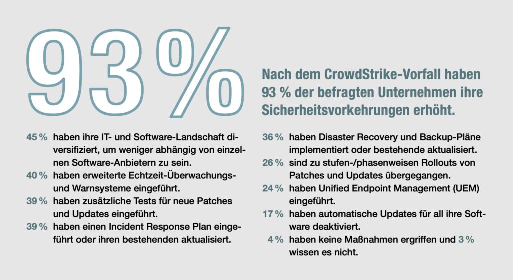 Reale Ereignisse lösen oft konkrete Maßnahmen aus – und der CrowdStrike-Vorfall ist ein Paradebeispiel dafür: Der Umfrage zufolge haben 93 % der Unternehmen als Reaktion auf diesen Vorfall zusätzliche Vorkehrungen getroffen, um ihre IT-Sicherheit zu stärken. Dazu gehören wohlgemerkt sowohl Organisationen, die direkt von dem Vorfall betroffen waren als auch solche, die es nicht waren. Diese hohe Reaktionsbereitschaft verdeutlicht, wie sehr externe Ereignisse als Beschleuniger für interne Veränderungen wirken. Es spiegelt ein wachsendes Bewusstsein dafür wider, dass Bedrohungsszenarien, die andere Unternehmen betreffen, als wertvolle Frühwarnsignale dienen. Zu den häufigsten Maßnahmen, die Unternehmen umgesetzt haben, zählen:- Diversifizierung der IT- und Software-Landschaft, um weniger abhängig von einzelnen Anbietern zu sein