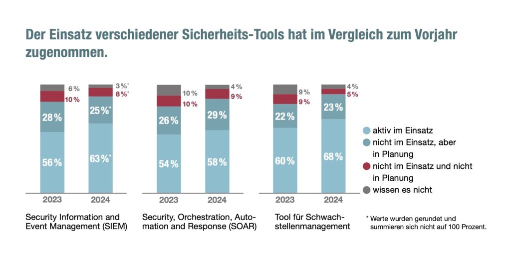 Schwachstellenmanagement (Vulnerability Management) ist ein wesentlicher Bestandteil von IT-Sicherheit und Risikomanagement. Ein besonders hohes Risiko geht von Schwachstellen oder beschädigten Dateien in Unternehmenssystemen und -geräten sowie Schwachstellen, Datenschutzverletzungen oder Missbrauch von KI-Tools oder -Services aus. Jeweils 38 % der Befragten berichten, dass diese in der Vergangenheit extreme oder erhebliche Schäden oder Risiken für ihr Unternehmen verursacht haben. Vulnerability Management Tools helfen IT Security Teams, dies zu verhindern. Etwas mehr als zwei Drittel nutzen bereits solche Tools, was einem Anstieg von 12 % im Vergleich zu 2023 entspricht. Weitere 23 % planen, ein Schwachstellenmanagement-Tool einzuführen.
