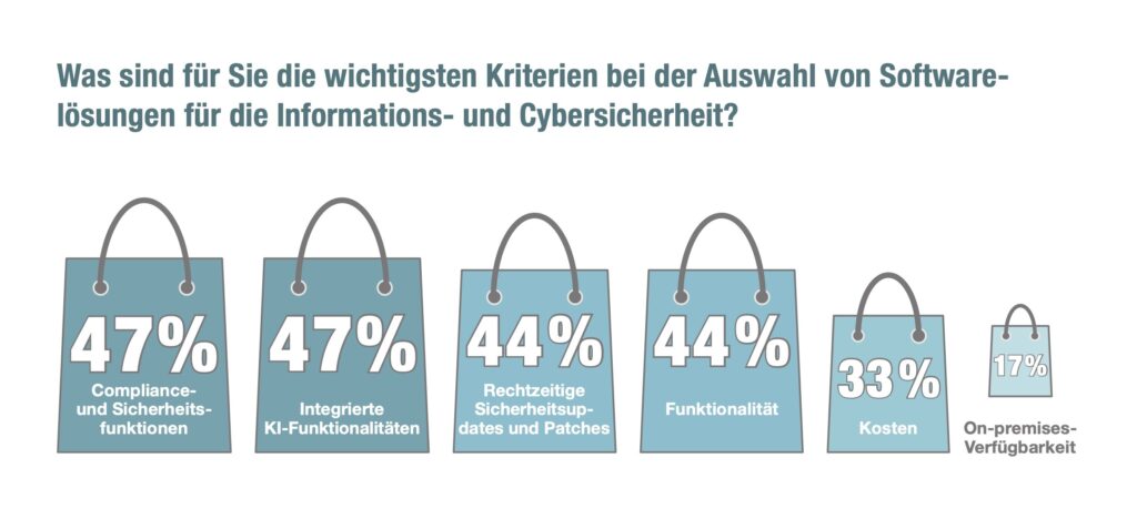 Während Integrationsfähigkeit mit 38 % zu den fünf wichtigsten Kriterien gehört, rangieren Support und Training nach dem Kauf mit 26 % nur auf Platz neun. In erster Linie legen die Teams Wert auf Compliance- und Sicherheitsfunktionen sowie integrierte KI-Funktionalitäten – ein Hinweis darauf, dass Trends wie Künstliche Intelligenz und Regulierungen wie NIS-2 oder DORA die Agenda und die Arbeitsweise von IT- und Cybersecurity-Teams erheblich beeinflussen. An zweiter Stelle folgen zeitnahe Sicherheitsupdates und Patches sowie Funktionalität.